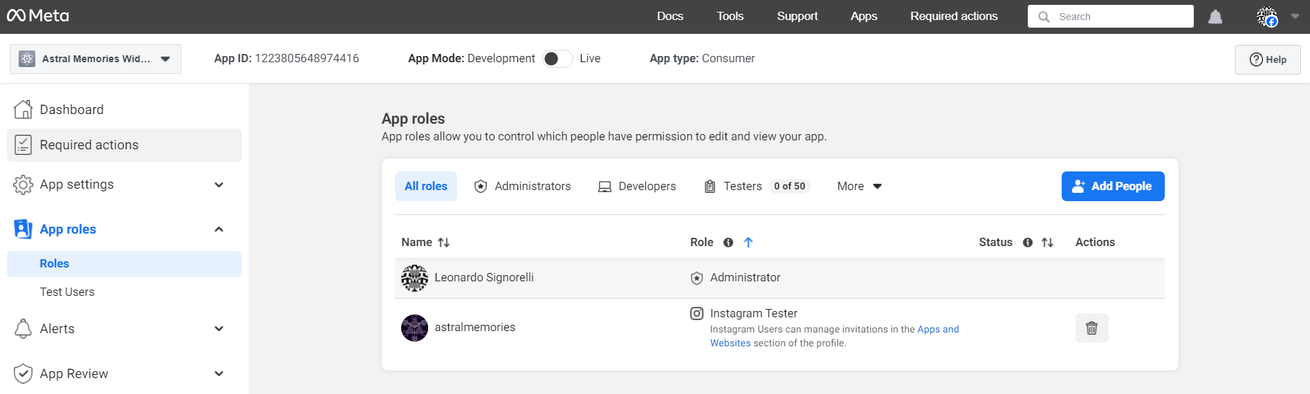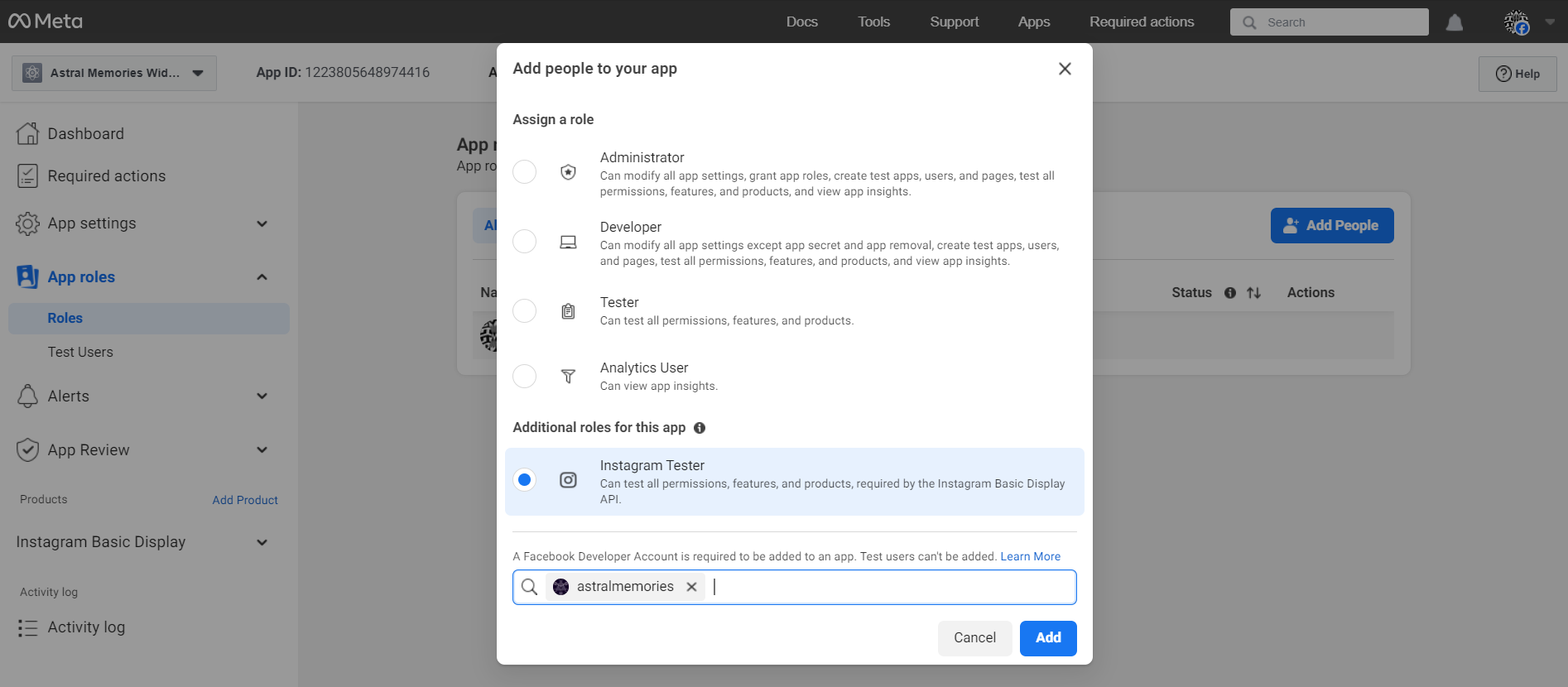 Under the "Additional roles for this app" section, select the "Instagram Tester" option and enter your Instagram account's username.