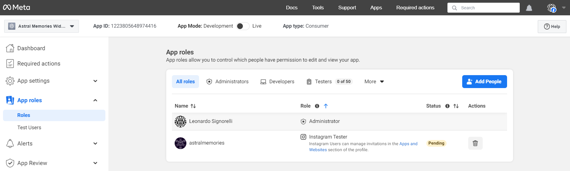 Click the "Add" button to send the invitation. You should see the word "Pending" next to the Instagram Tester.