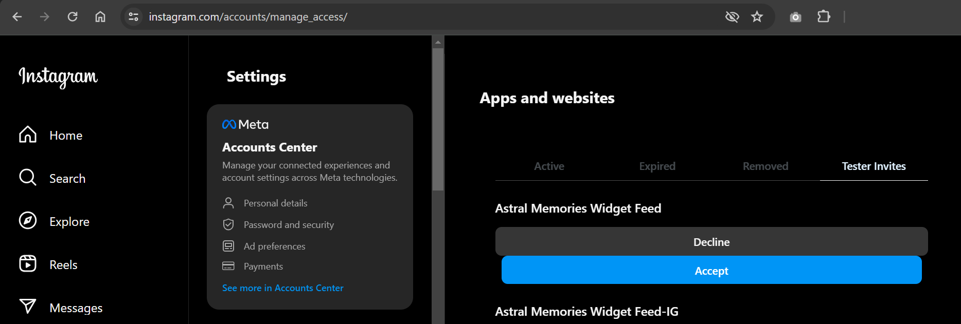 Open a new web browser and go to www.instagram.com and sign into your Instagram account that you just invited. Navigate to (Profile Icon) > Edit Profile > Website permissions -> Apps and Websites > Tester Invites and accept the invitation.