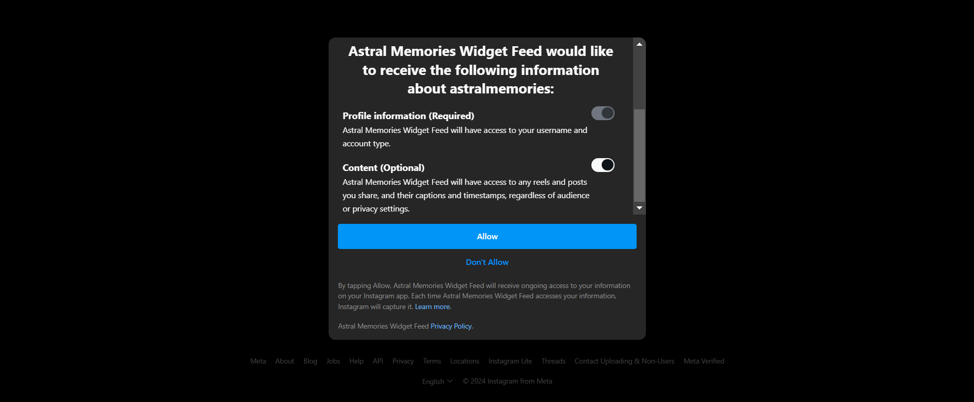 After submitting your Instagram App ID, an Authorization Window will open in a new tab requesting permission for your Facebook application to access your Instagram profile information and content. Simply click "Allow" to proceed.