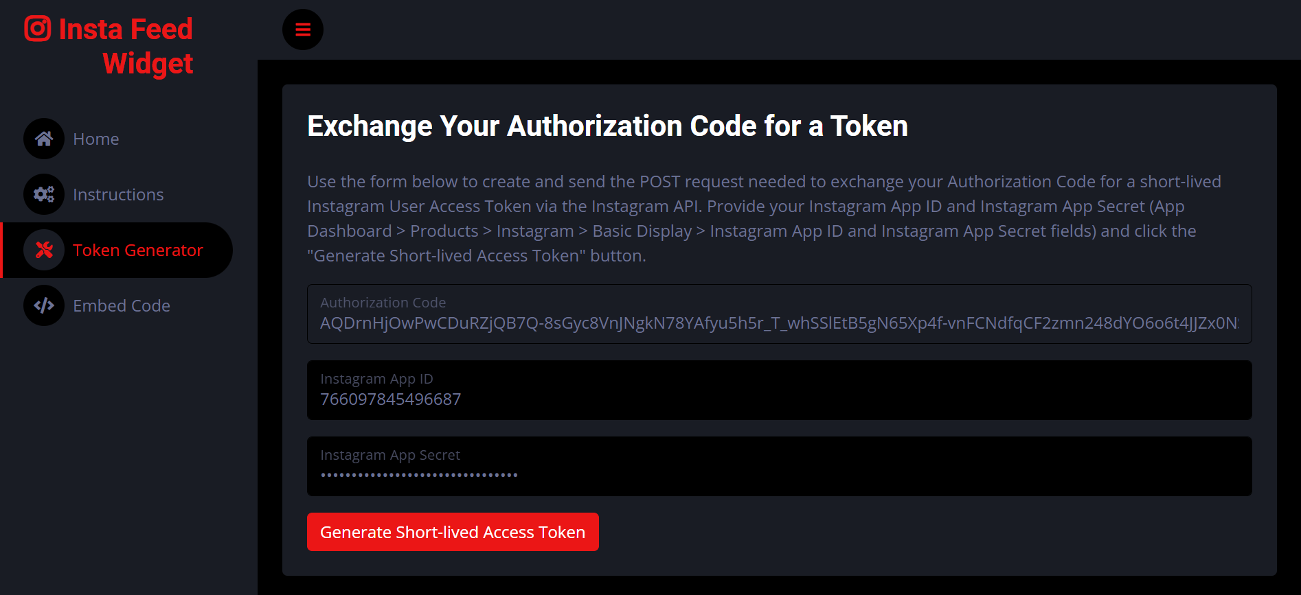 Once you've granted permission for your Facebook application to access your Instagram profile information and content, you'll be redirected to the “Token Generator” page in a new tab (instafeedwidget.freewebtools.net/authenticate_generate_token.php). The generated Authorization Code will be passed via the code query string parameter. The “Token Generator” page will automatically capture the authorization code and append it to the form on the page, which you will then use to exchange for a short-lived Instagram User Access Token.