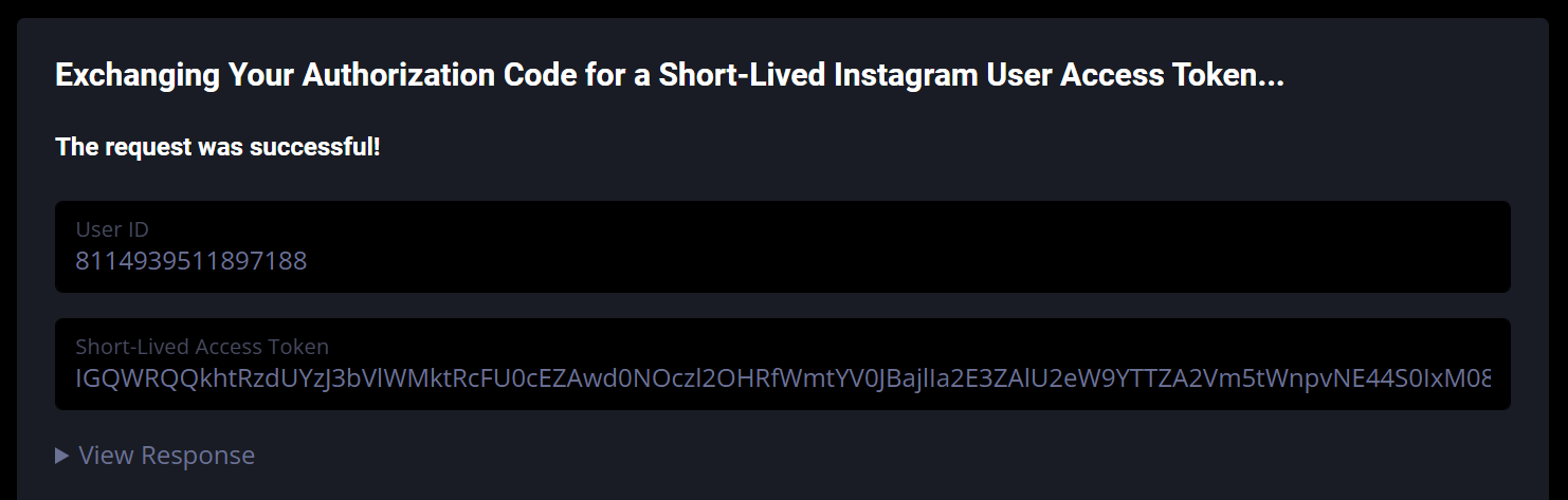 The Token Generator page will first exchange your Authorization Code for a Short-Lived Instagram User Access Token. Once completed, you'll see the message "The request was successful," along with your User ID and the newly generated Short-Lived Instagram User Access Token.