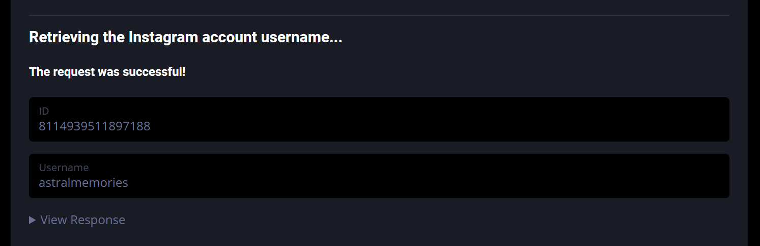 Next, the Token Generator page will use your User ID to retrieve your Instagram account username. You'll see the message "The request was successful," along with your User ID and Instagram username.