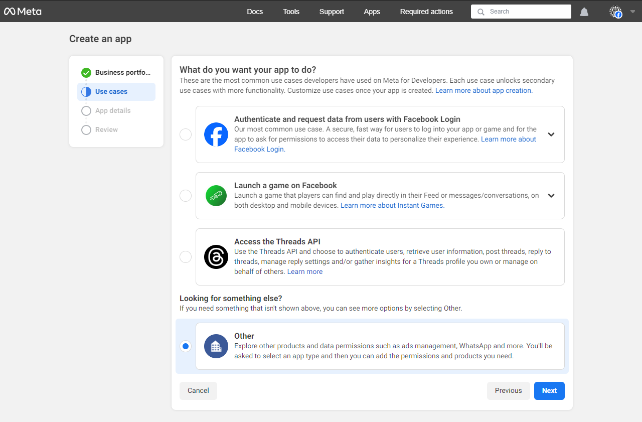 You should see a new screen with the question What do you want your app to do? Select "Other" and click the "Next" button: