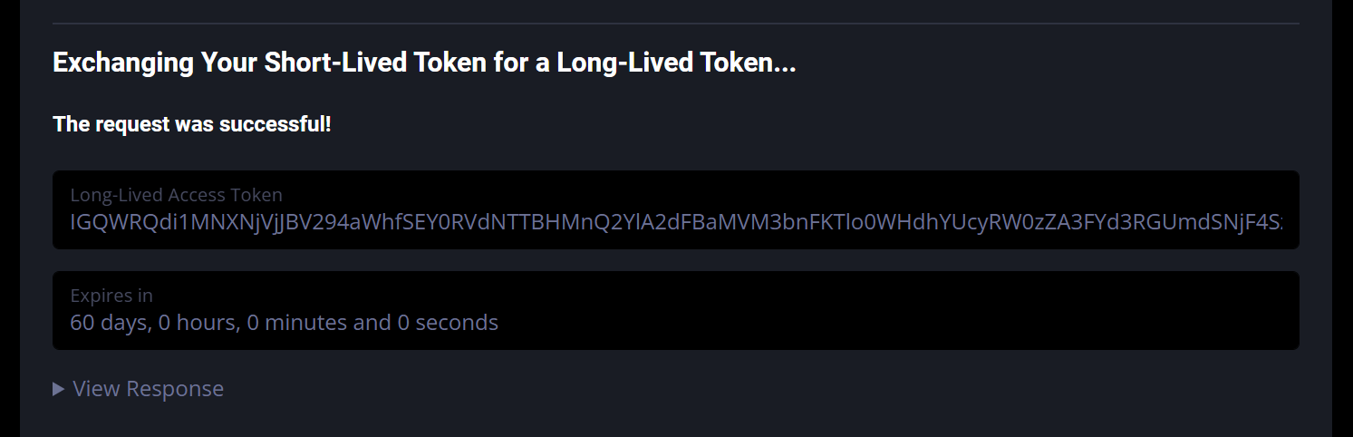 You'll see the message "The request was successful," along with the new generated Long-Lived Access Token.