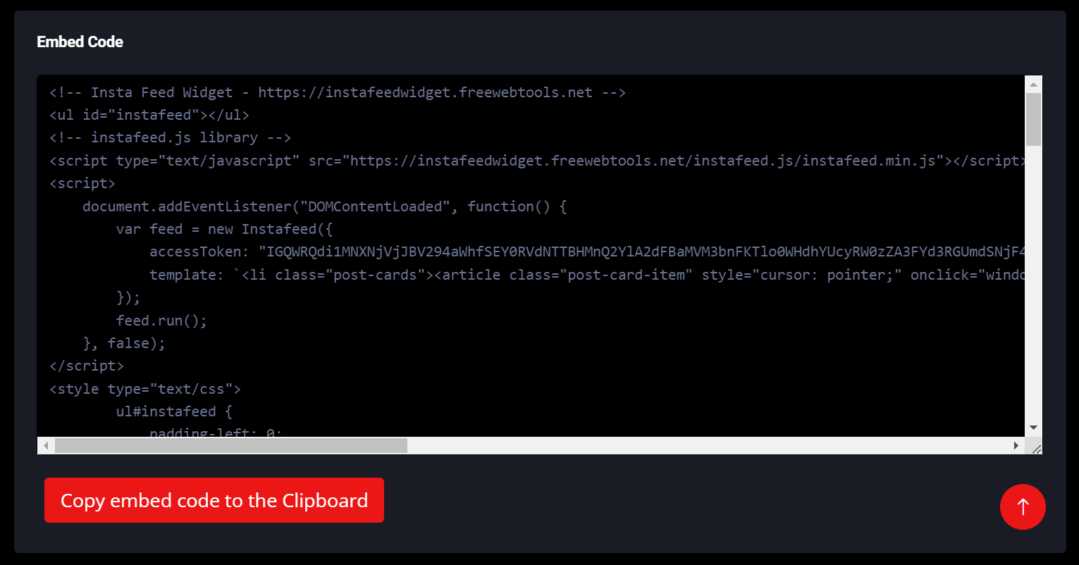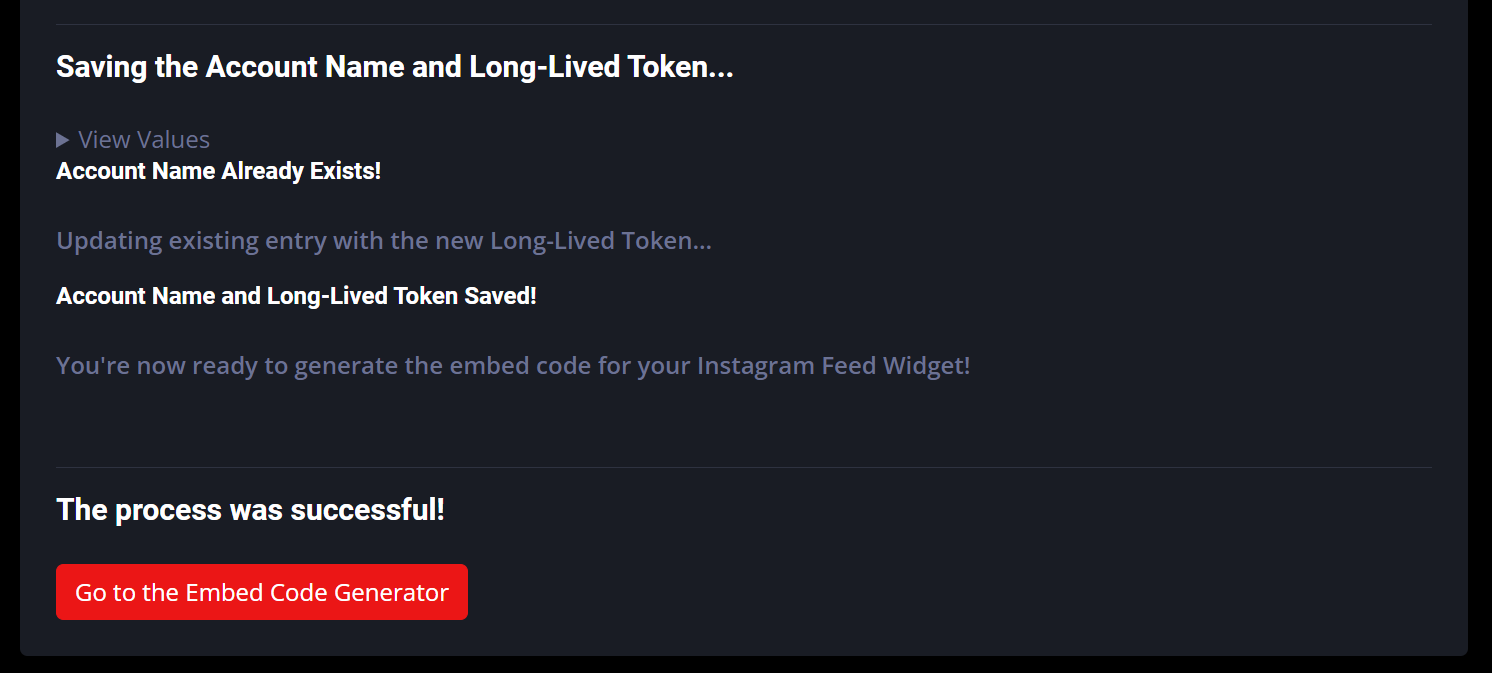 After saving your Instagram account username and Long-Lived Access Token, you're all set to generate the embed code for your Instagram Feed Widget.