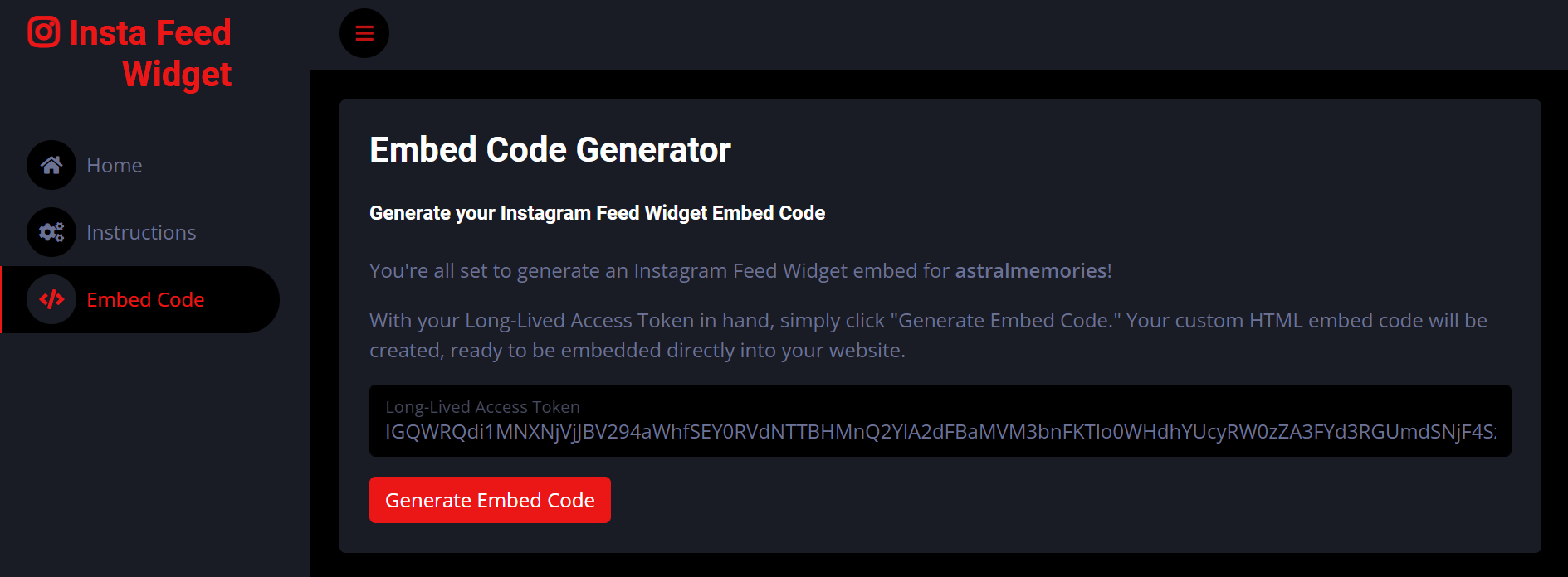 Click the “Go to the Embed Code Generator” button to be redirected to the Embed Code page, where your Long-Lived Access Token will be automatically added to the form.