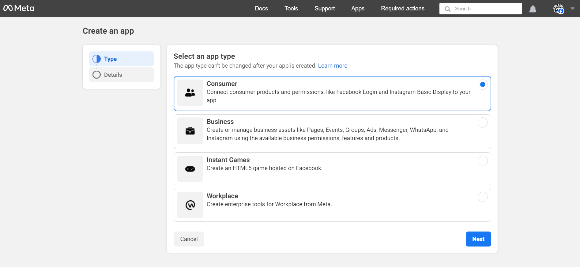 In the "Select an app type" screen, select "Consumer" and click "Next".