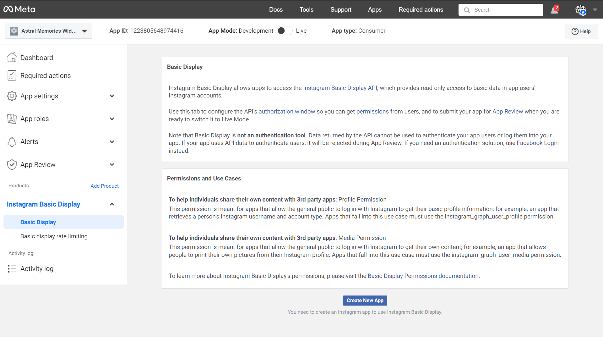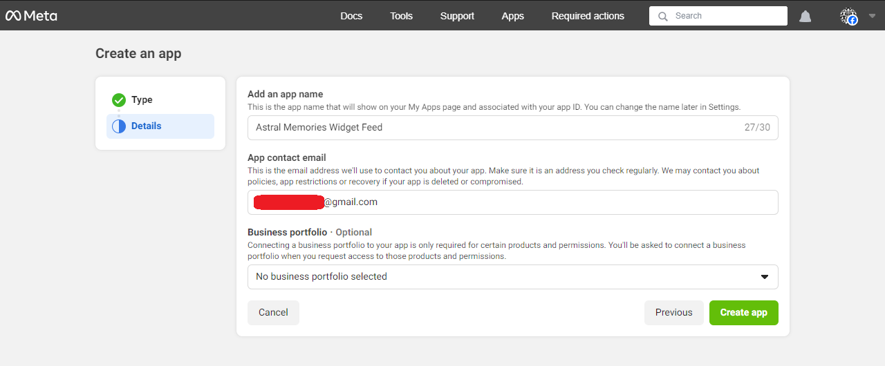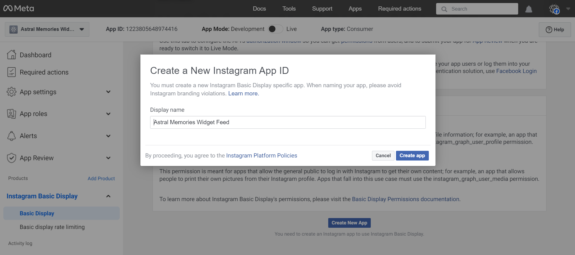- Display Name: Enter the name of the Facebook app you just created (Astral Memories Widget Feed). Then click Create app.