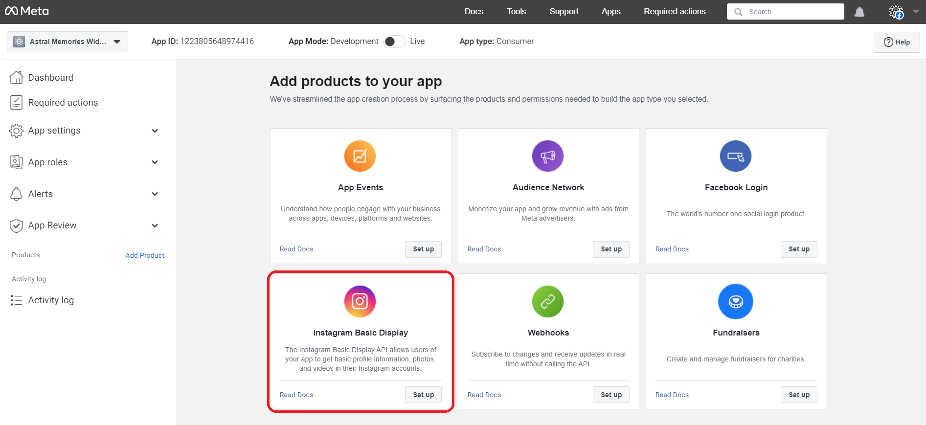 - Scroll until you see the Instagram Basic Display product. Instagram Basic Display will allow your Meta App to access the Instagram Basic Display API, which provides read-only access to basic data from your Instagram account.