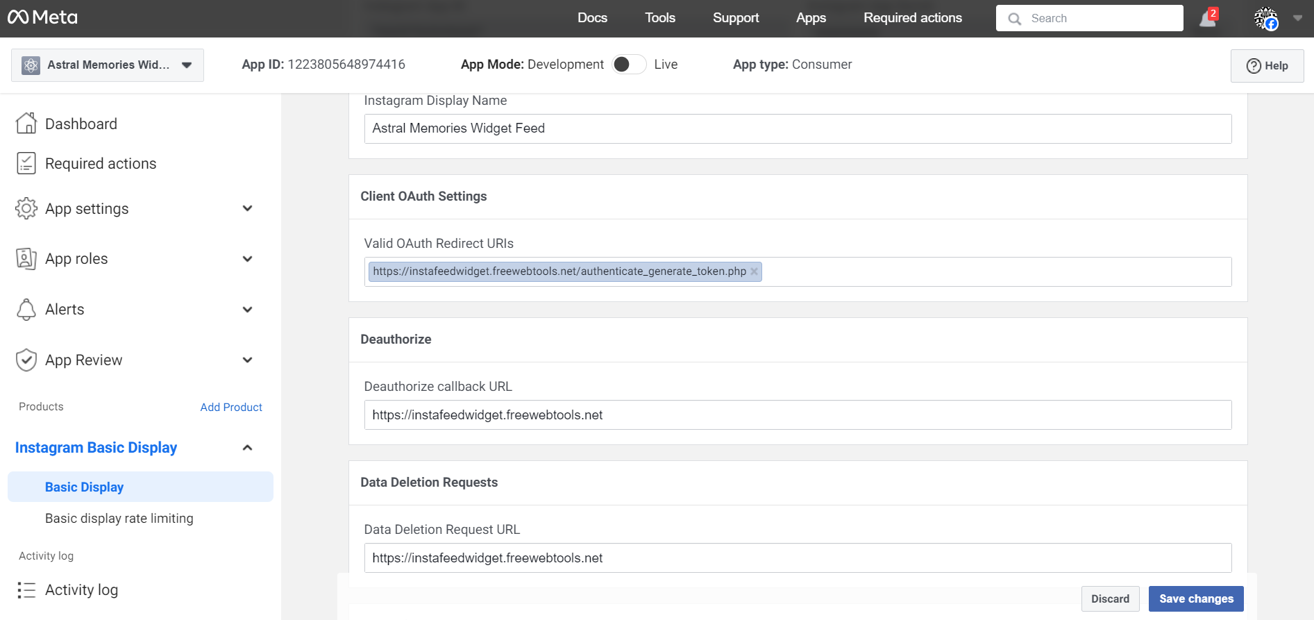 - Valid OAuth Redirect URIs: https://instafeedwidget.freewebtools.net/authenticate_generate_token.php